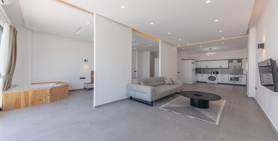 Villamızın iç mekanında modern mobilyalar ve tam donanımlı bir mutfak bulunuyor. Kendi yemeğinizi hazırlarken evinizin rahatlığını hissedebilir, her detayı özenle düşünülmüş yaşam alanlarında keyifle vakit geçirebilirsiniz. Klima ile donatılmış yatak odası, yazın sıcak günlerinde serin bir ortamda dinlenmenizi sağlar. Ayrıca, muhafazakar aileler için uygun olan özel havuzumuz, size özel anlar sunar.